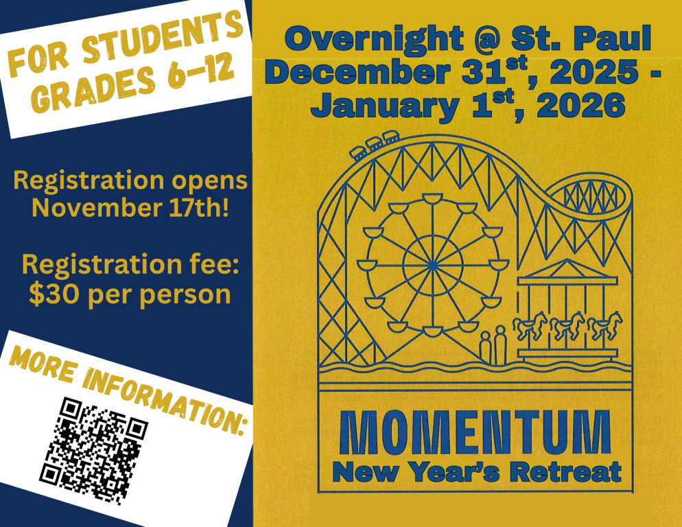 This overnight retreat takes place on Wednesday, December 31, 2025 through Thursday, January 1, 2026, and is open for students in 6th-12th grades.